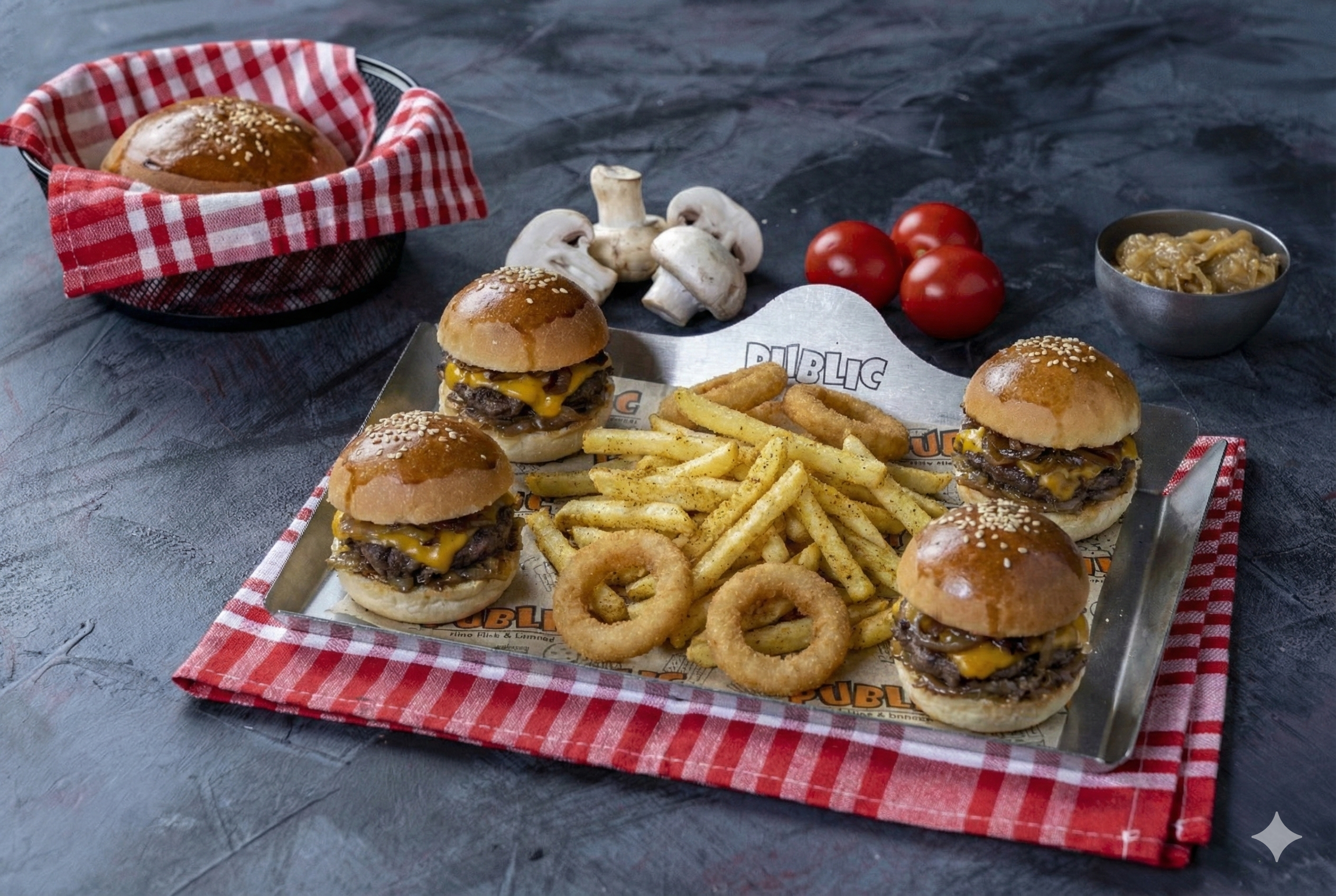 Köfte, marul, cheddar, turşu, domates, parmak patates.